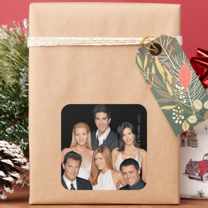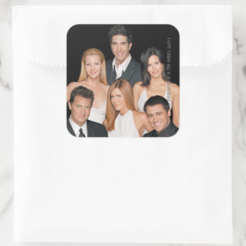 FRIENDS™ Cast In Formal Wear Closeup Square Sticker vinyl sticker, waterproof durable collectible sticker for laptop, phone, bottle, bike, notebook, helmet, and accessories.