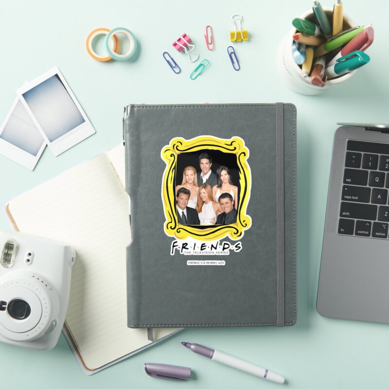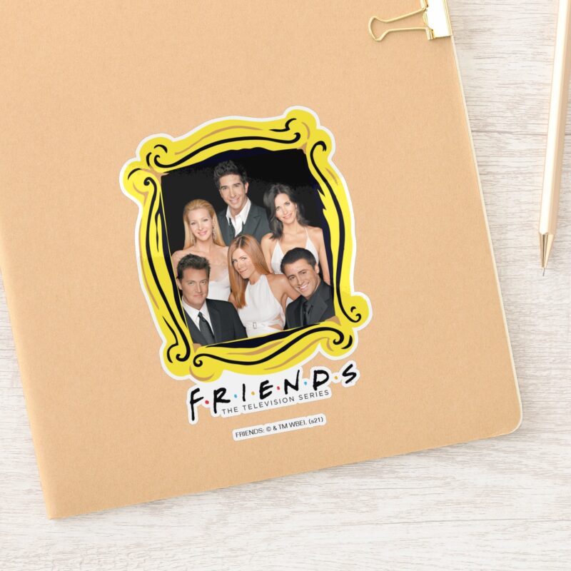 FRIENDS™ Cast In Formal Wear Closeup Sticker vinyl sticker, waterproof durable collectible sticker for laptop, phone, bottle, bike, notebook, helmet, and accessories.