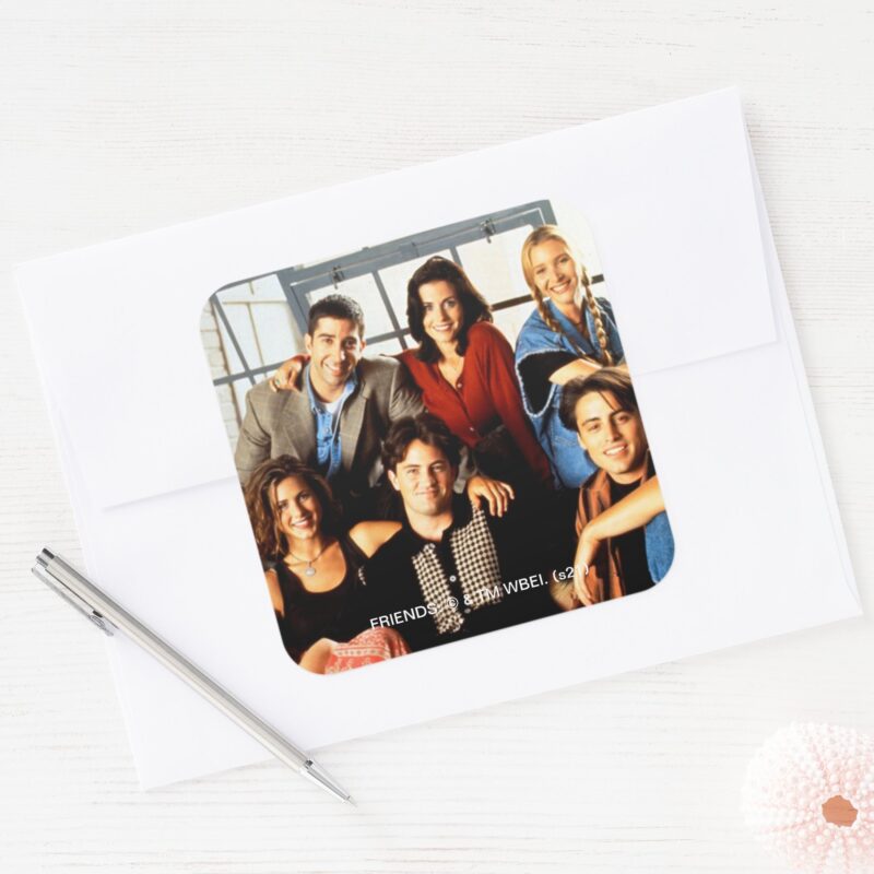 FRIENDS™ Cast Sitting In Monicas Apartment Square Sticker vinyl sticker, waterproof durable collectible sticker for laptop, phone, bottle, bike, notebook, helmet, and accessories.