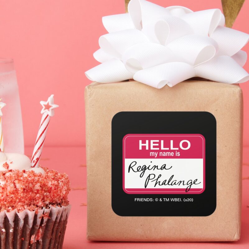 FRIENDS™ Hello My Name Is Regina Phalange Square Sticker vinyl sticker, waterproof durable collectible sticker for laptop, phone, bottle, bike, notebook, helmet, and accessories.