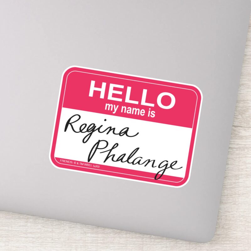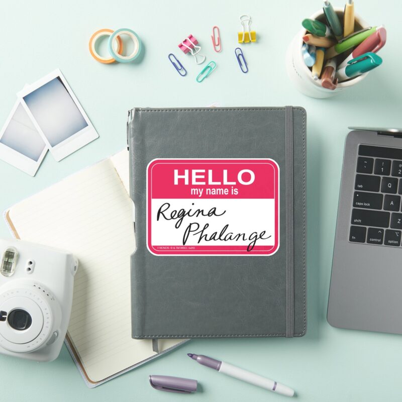 FRIENDS™ Hello My Name Is Regina Phalange Sticker vinyl sticker, waterproof durable collectible sticker for laptop, phone, bottle, bike, notebook, helmet, and accessories.