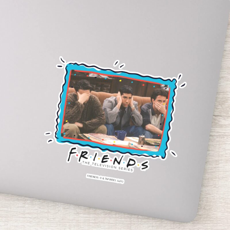 FRIENDS™ Joey Ross And Chandler On The Couch Sticker vinyl sticker, waterproof durable collectible sticker for laptop, phone, bottle, bike, notebook, helmet, and accessories.