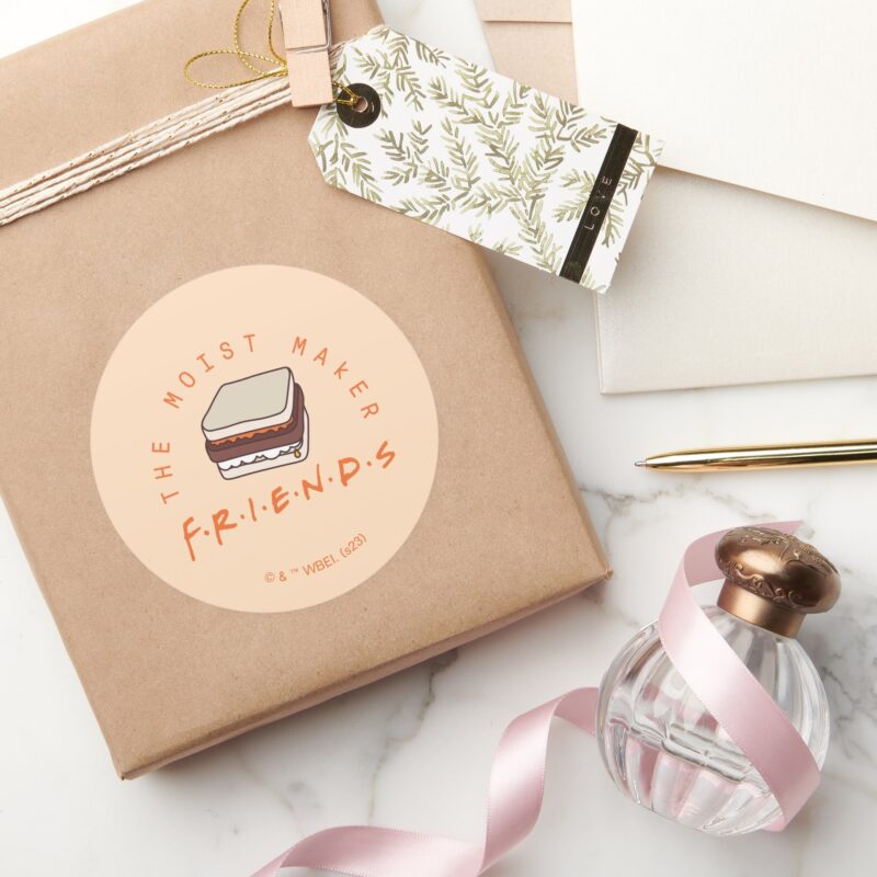 FRIENDS™ The Moist Maker Classic Round Sticker vinyl sticker, waterproof durable collectible sticker for laptop, phone, bottle, bike, notebook, helmet, and accessories.