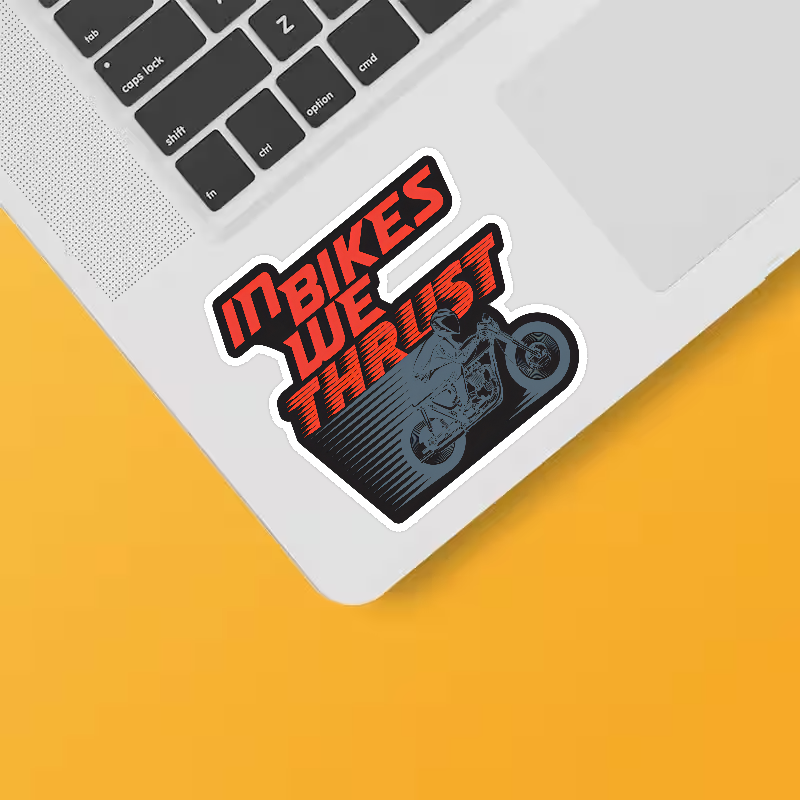 Full Throttle Faith In Bikes We Thrust Sticker vinyl sticker, waterproof durable collectible sticker for laptop, phone, bottle, bike, notebook, helmet, and accessories.
