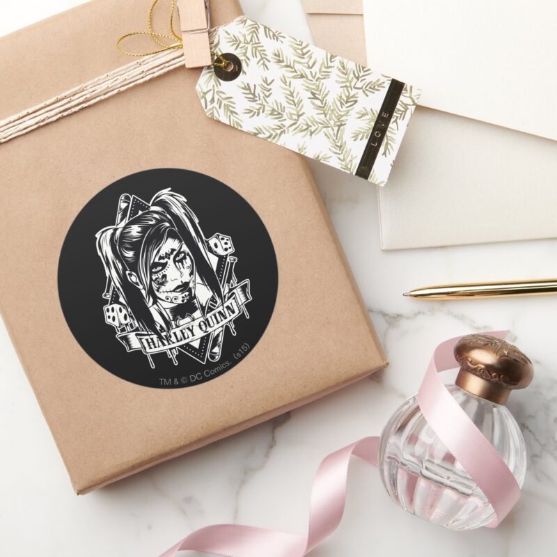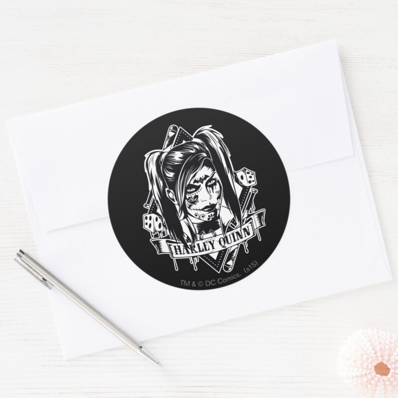 Harley Quinn Badge Classic Round Sticker vinyl sticker, waterproof durable collectible sticker for laptop, phone, bottle, bike, notebook, helmet, and accessories.