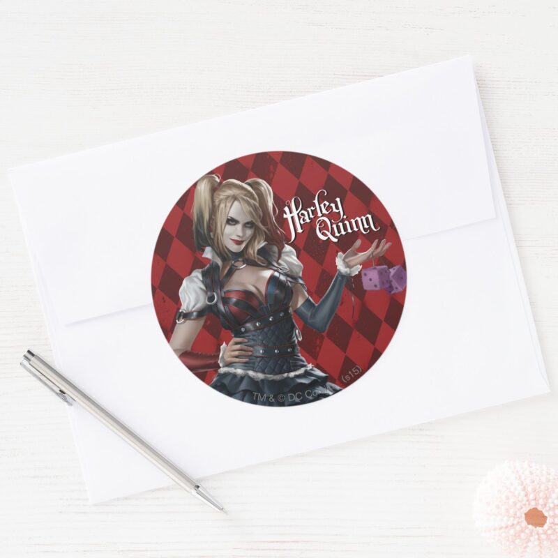 Harley Quinn With Fuzzy Dice Classic Round Sticker vinyl sticker, waterproof durable collectible sticker for laptop, phone, bottle, bike, notebook, helmet, and accessories.
