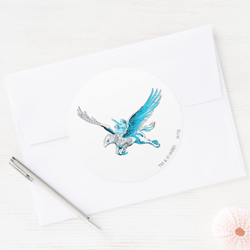 Harry And Hermione On A Hippogriff Classic Round Sticker vinyl sticker, waterproof durable collectible sticker for laptop, phone, bottle, bike, notebook, helmet, and accessories.
