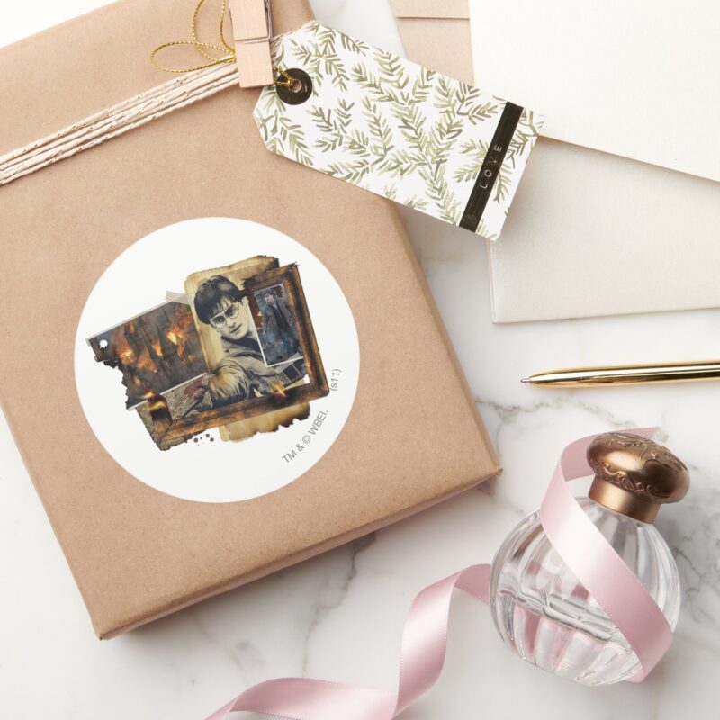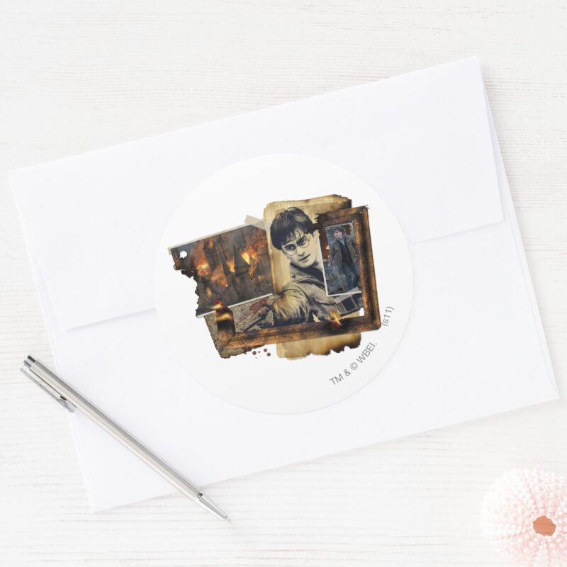 Harry Potter Collage 7 Classic Round Sticker vinyl sticker, waterproof durable collectible sticker for laptop, phone, bottle, bike, notebook, helmet, and accessories.