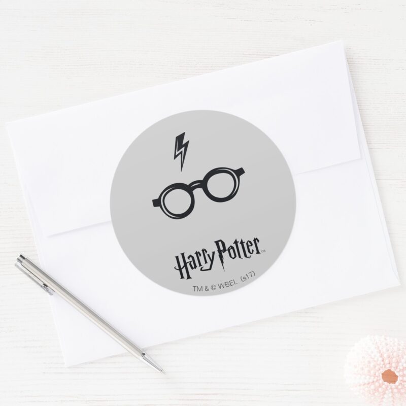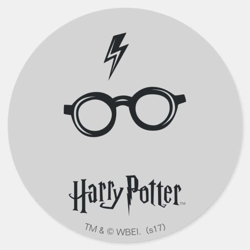 Harry Potter Lightning Scar And Glasses Classic Round Sticker vinyl sticker, waterproof durable collectible sticker for laptop, phone, bottle, bike, notebook, helmet, and accessories.