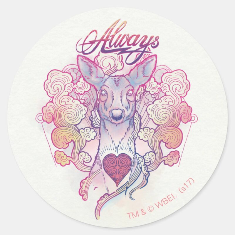 Harry Potter Spell Always Doe Patronus Classic Round Sticker vinyl sticker, waterproof durable collectible sticker for laptop, phone, bottle, bike, notebook, helmet, and accessories.