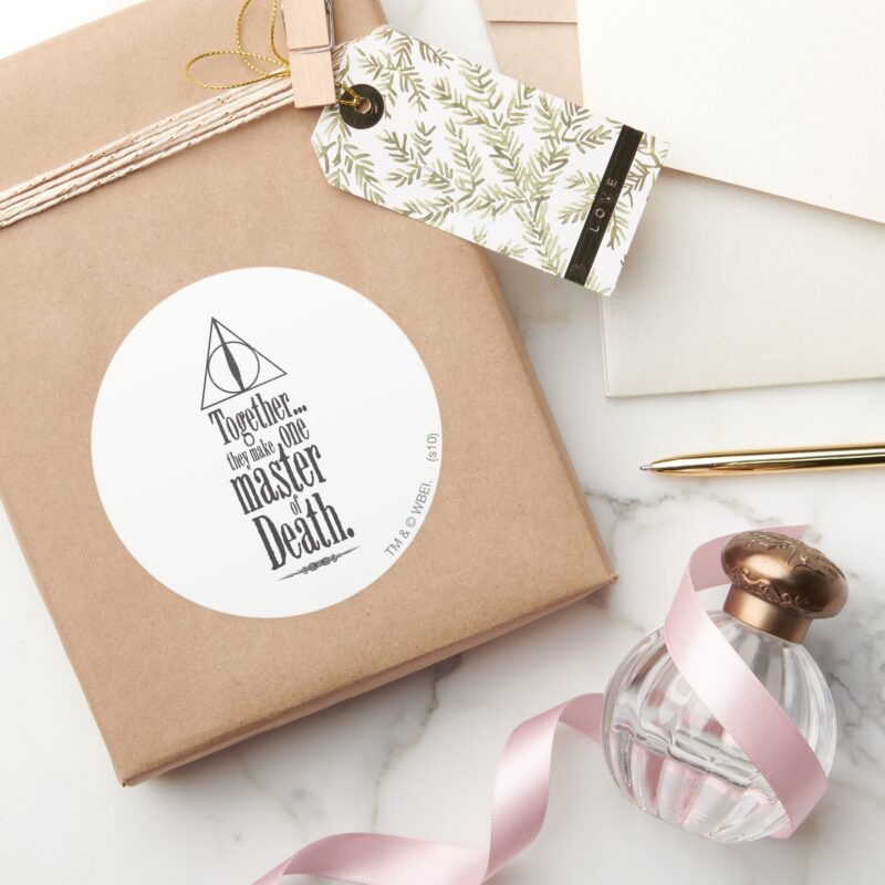 Harry Potter Spell Master Of Death Classic Round Sticker vinyl sticker, waterproof durable collectible sticker for laptop, phone, bottle, bike, notebook, helmet, and accessories.
