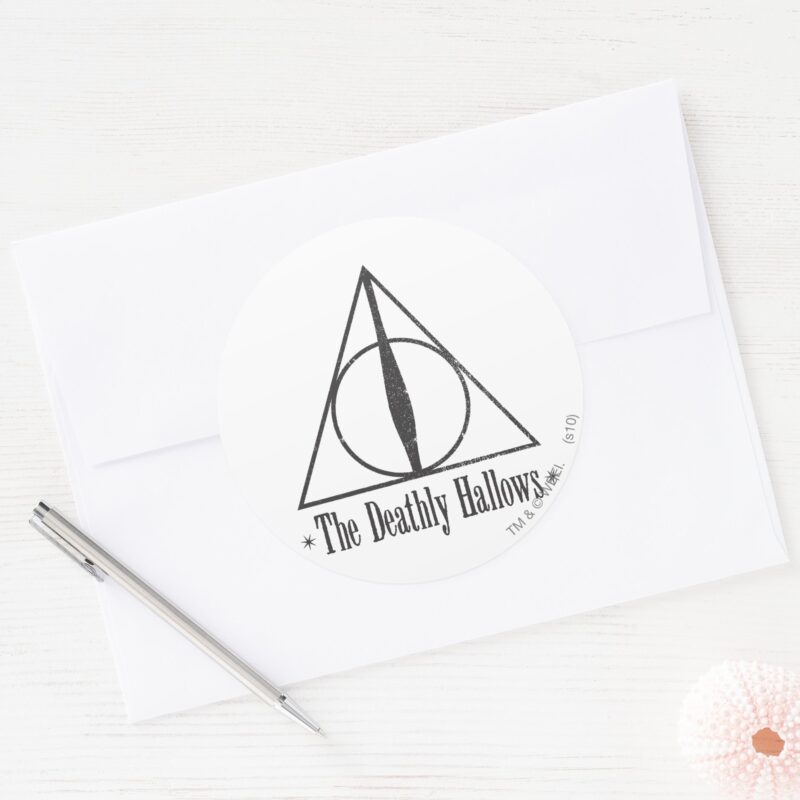 Harry Potter The Deathly Hallows Emblem Classic Round Sticker vinyl sticker, waterproof durable collectible sticker for laptop, phone, bottle, bike, notebook, helmet, and accessories.