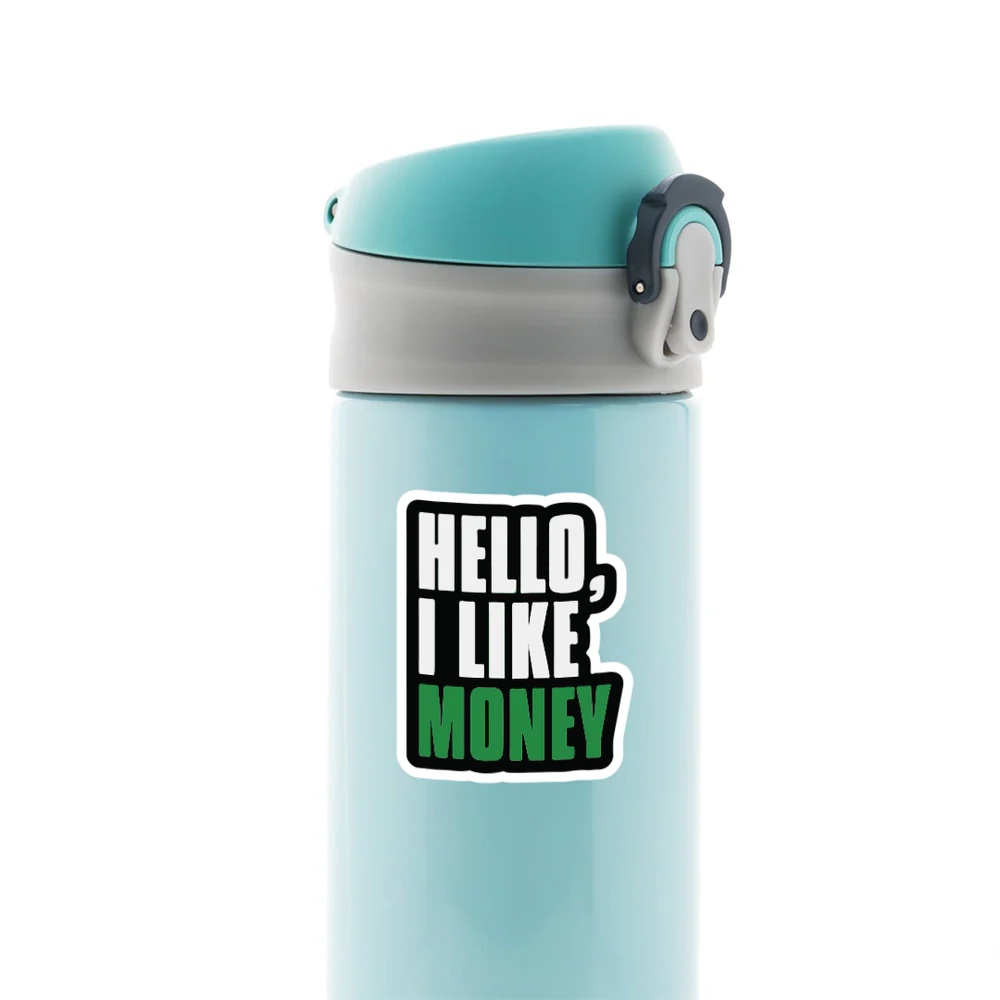 Hello I Like Money Witty Stickers vinyl sticker, waterproof durable collectible sticker for laptop, phone, bottle, bike, notebook, helmet, and accessories.