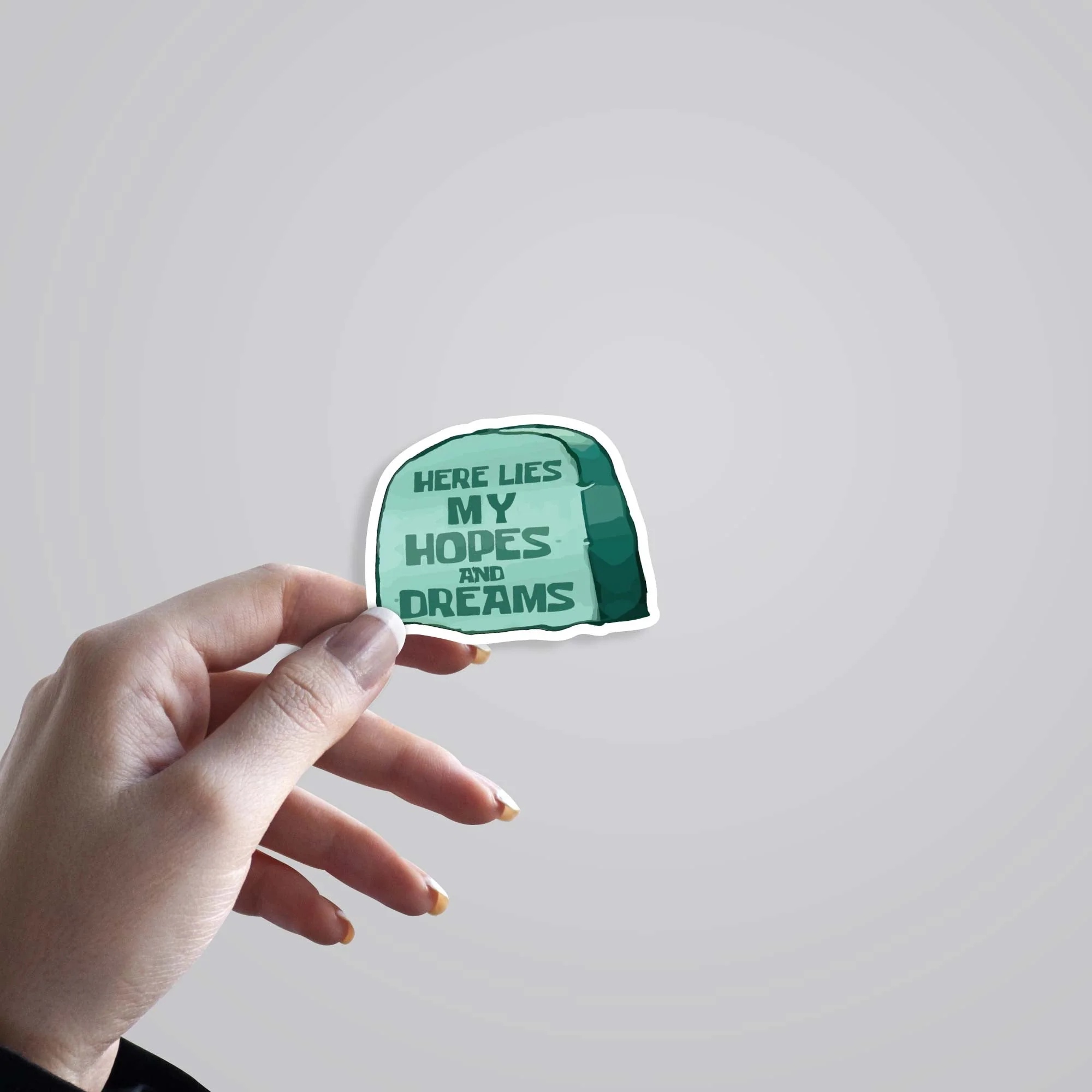 Here Lies My Hopes And Dreams Witty Stickers vinyl sticker, waterproof durable collectible sticker for laptop, phone, bottle, bike, notebook, helmet, and accessories.