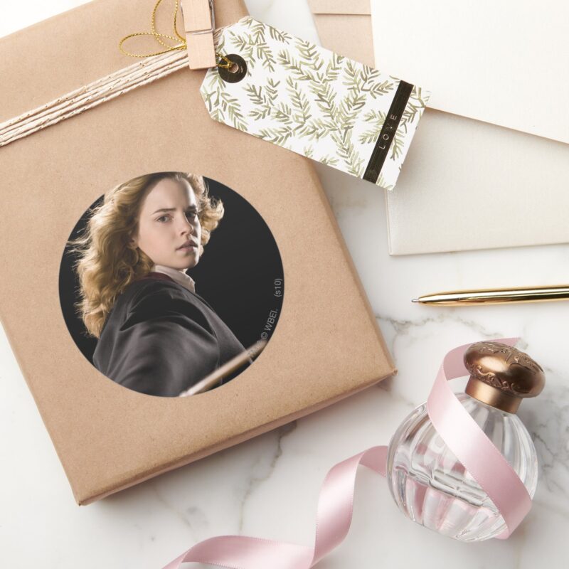 Hermione Granger Ready For Action Classic Round Sticker vinyl sticker, waterproof durable collectible sticker for laptop, phone, bottle, bike, notebook, helmet, and accessories.