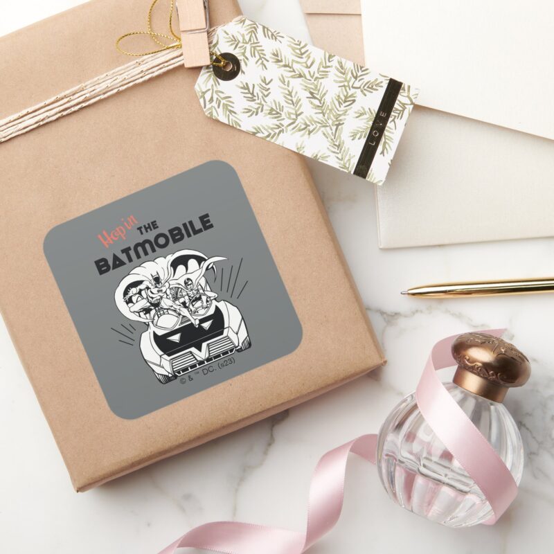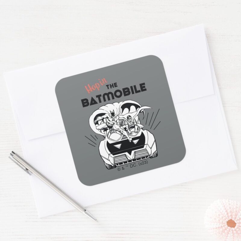 Hop In The Batmobile Square Sticker vinyl sticker, waterproof durable collectible sticker for laptop, phone, bottle, bike, notebook, helmet, and accessories.