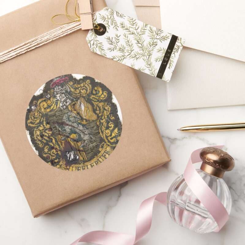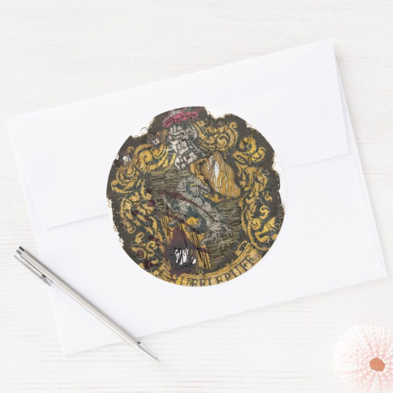 Hufflepuff Crest Destroyed Classic Round Sticker vinyl sticker, waterproof durable collectible sticker for laptop, phone, bottle, bike, notebook, helmet, and accessories.