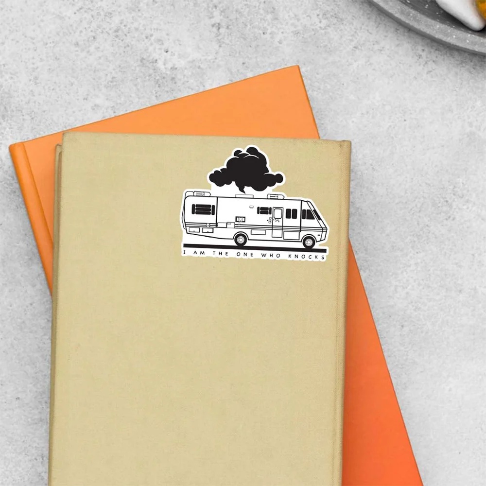 I Am The One Who Knocks RV TV Shows Stickers vinyl sticker, waterproof durable collectible sticker for laptop, phone, bottle, bike, notebook, helmet, and accessories.