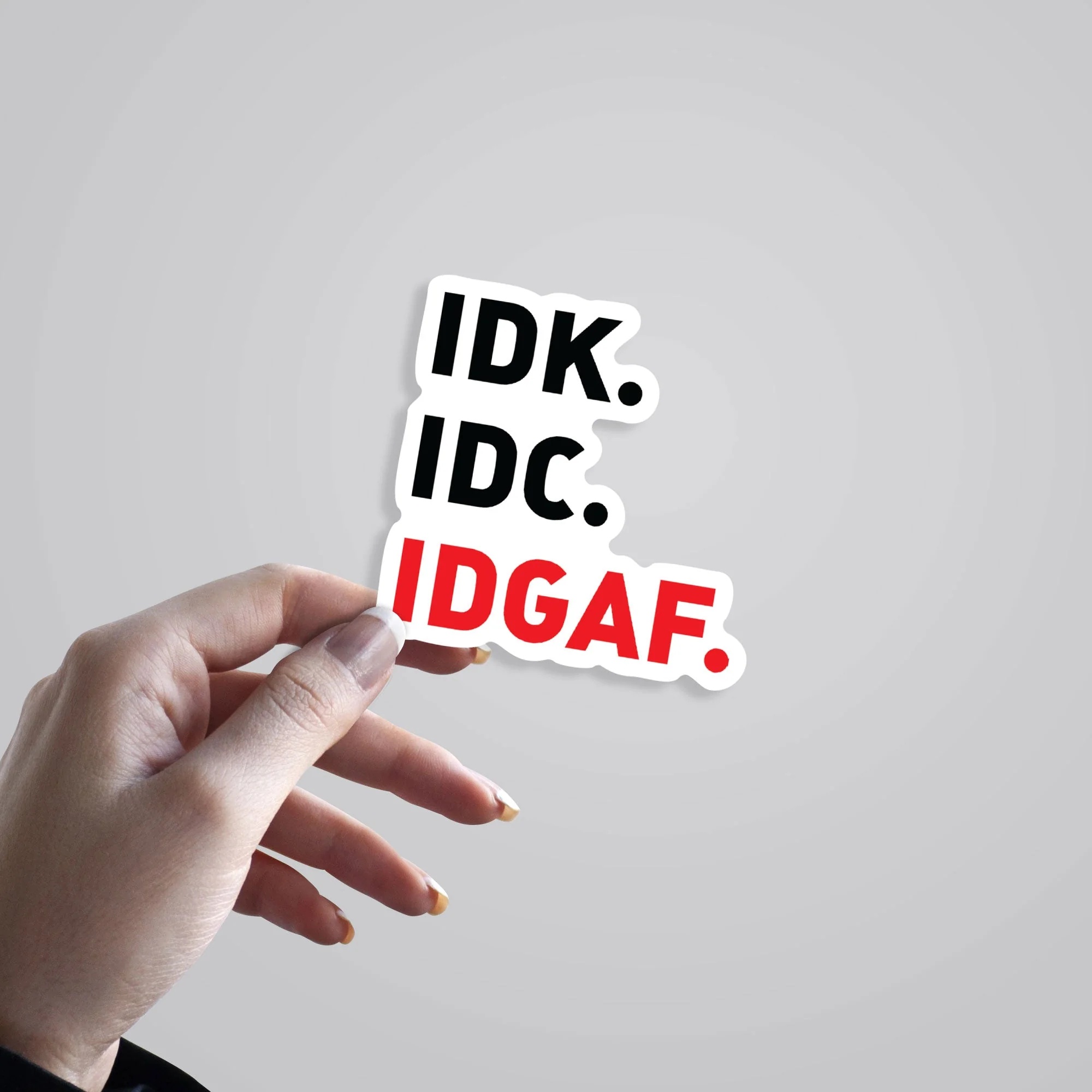 Idk Idc Idgaf Witty Stickers vinyl sticker, waterproof durable collectible sticker for laptop, phone, bottle, bike, notebook, helmet, and accessories.