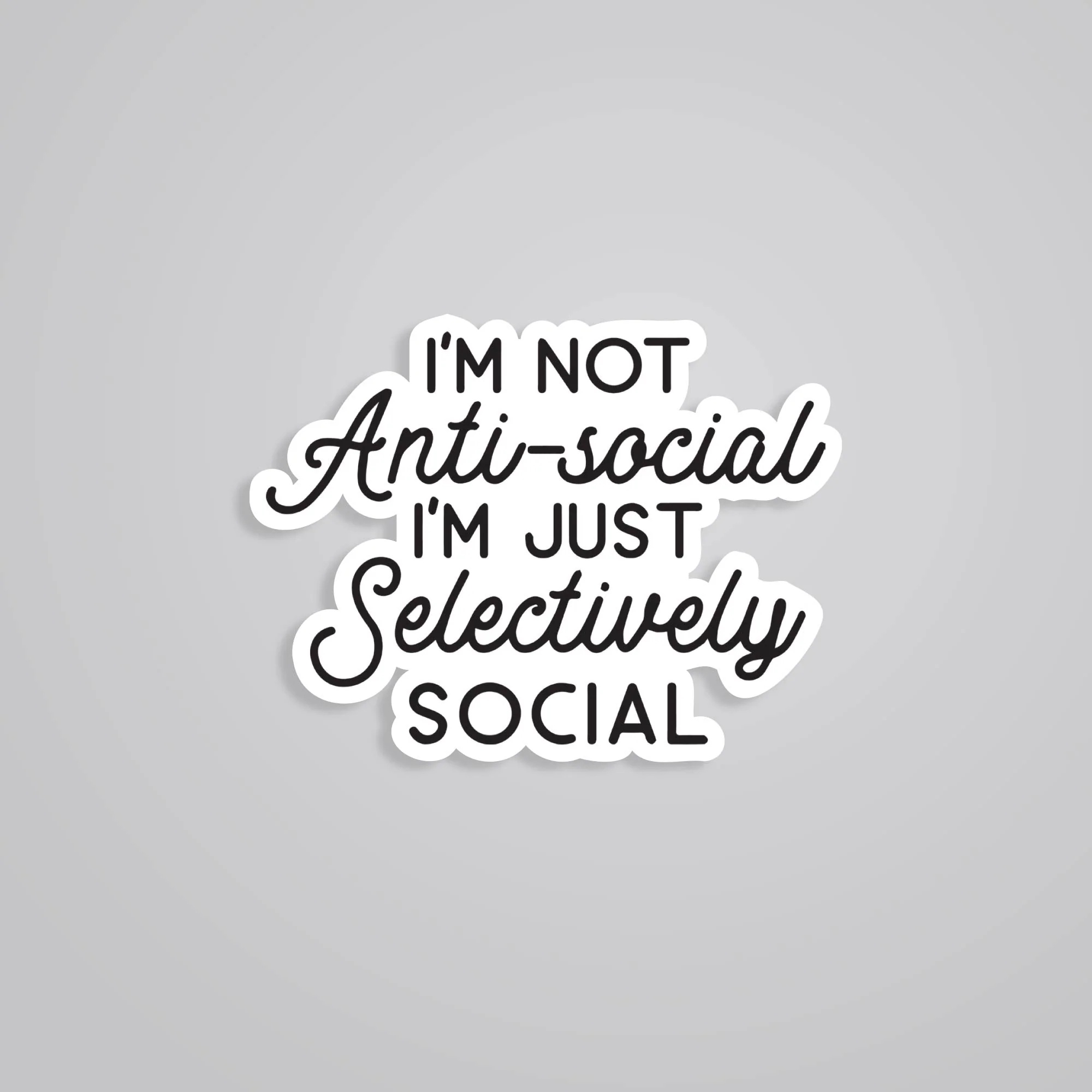 Im Not Antisocial Im Selevtively Social Witty Stickers vinyl sticker, waterproof durable collectible sticker for laptop, phone, bottle, bike, notebook, helmet, and accessories.