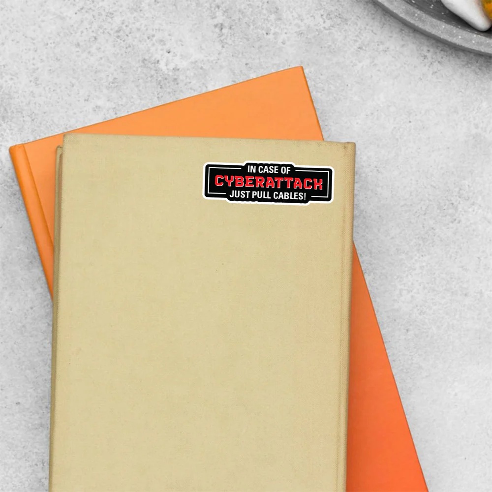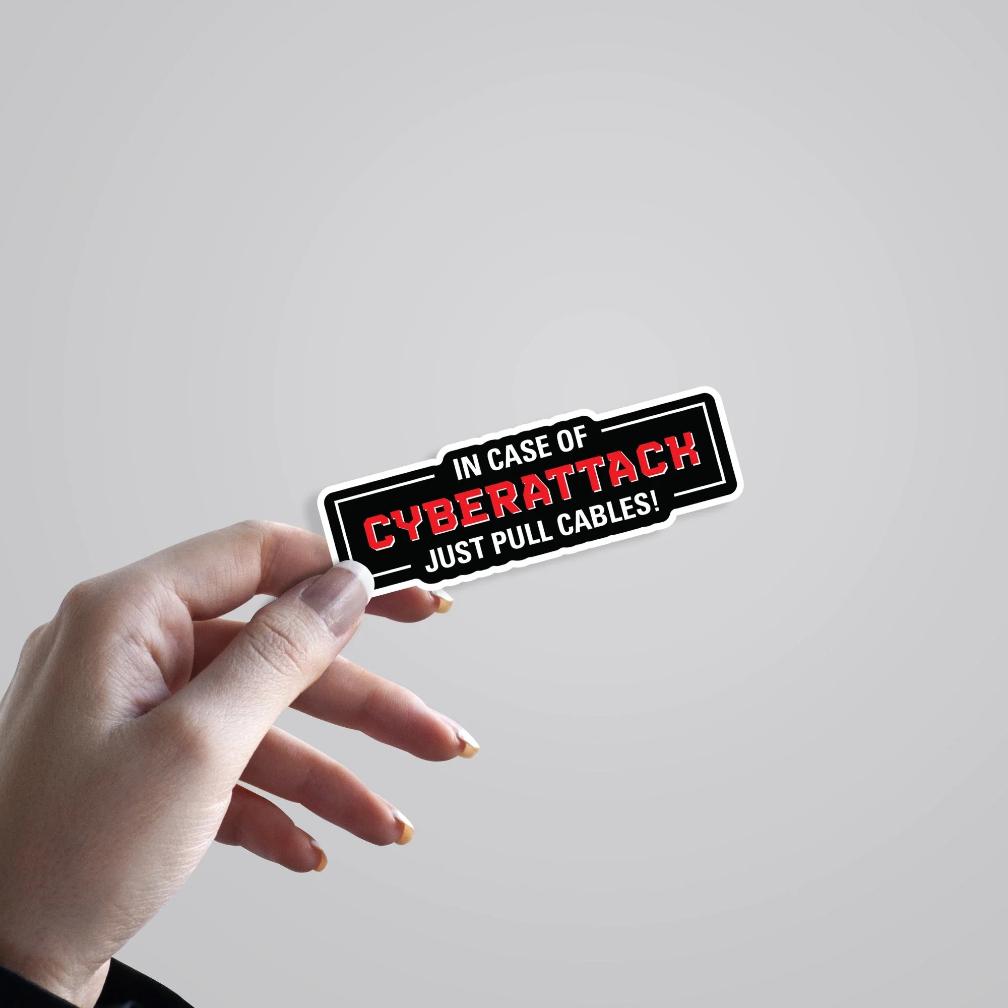 In Case Of Cyberattack Just Pull Cables Witty Stickers vinyl sticker, waterproof durable collectible sticker for laptop, phone, bottle, bike, notebook, helmet, and accessories.