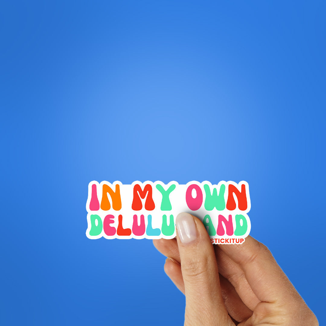 In My Own Delulu Land Sticker vinyl sticker, waterproof durable collectible sticker for laptop, phone, bottle, bike, notebook, helmet, and accessories.