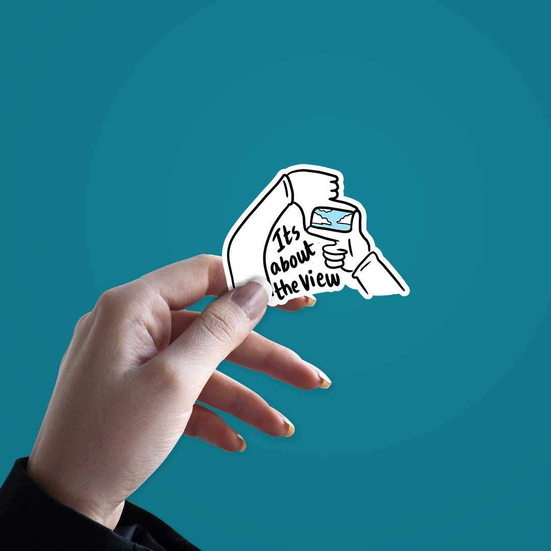 Its About The View Sticker vinyl sticker, waterproof durable collectible sticker for laptop, phone, bottle, bike, notebook, helmet, and accessories.