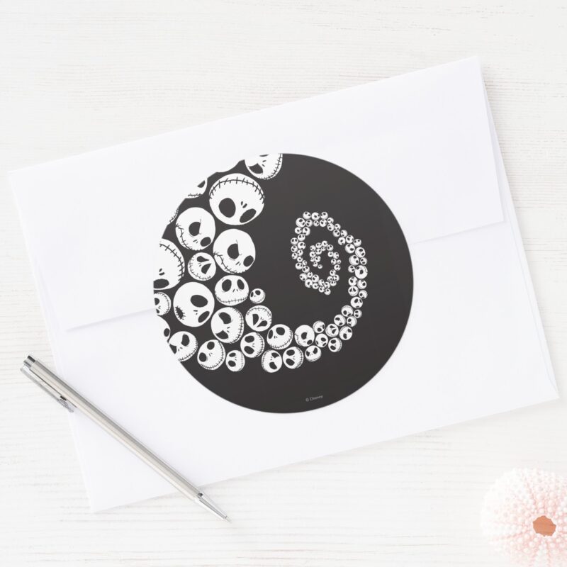 Jack Skellington Skull Swirl Classic Round Sticker vinyl sticker, waterproof durable collectible sticker for laptop, phone, bottle, bike, notebook, helmet, and accessories.