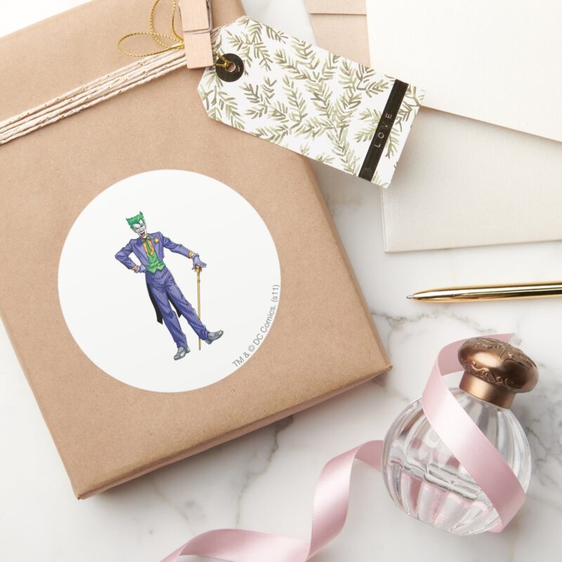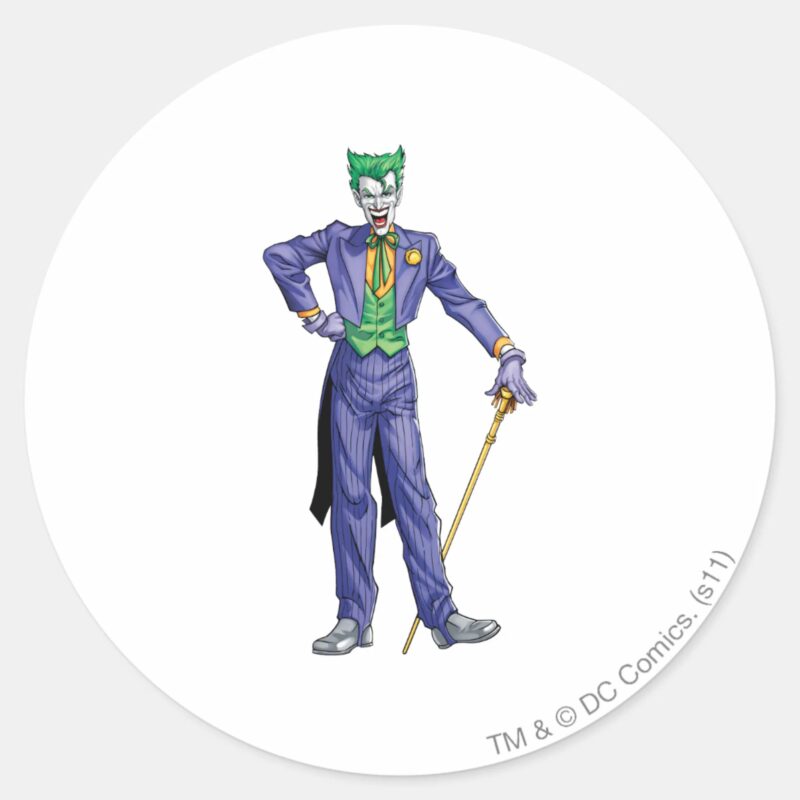 Joker Stands With Cane Classic Round Sticker vinyl sticker, waterproof durable collectible sticker for laptop, phone, bottle, bike, notebook, helmet, and accessories.