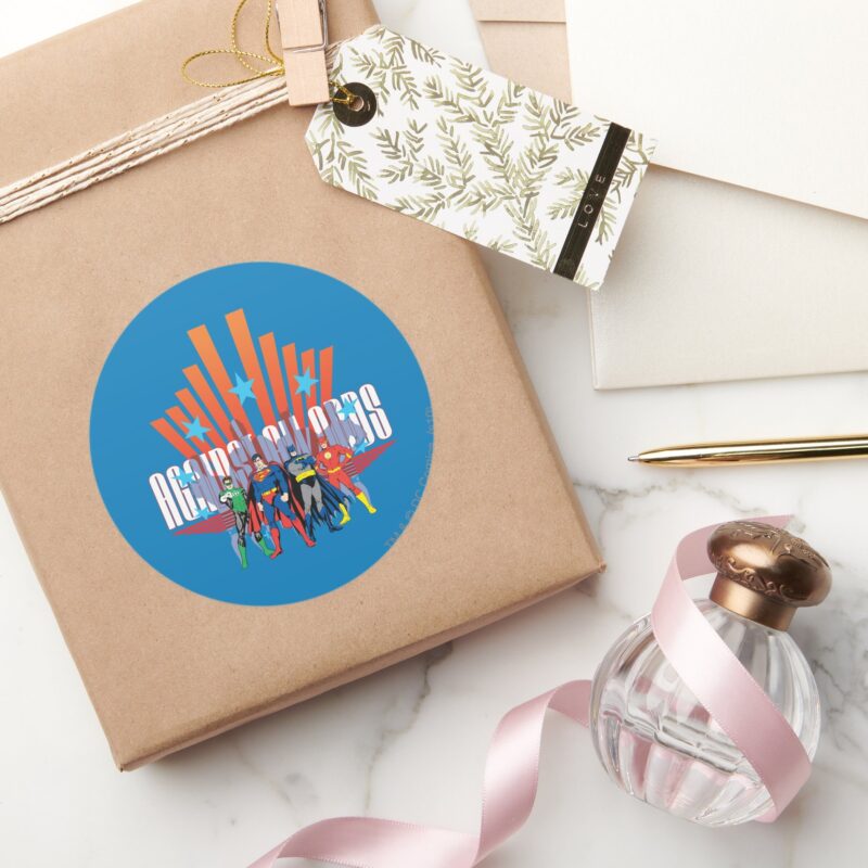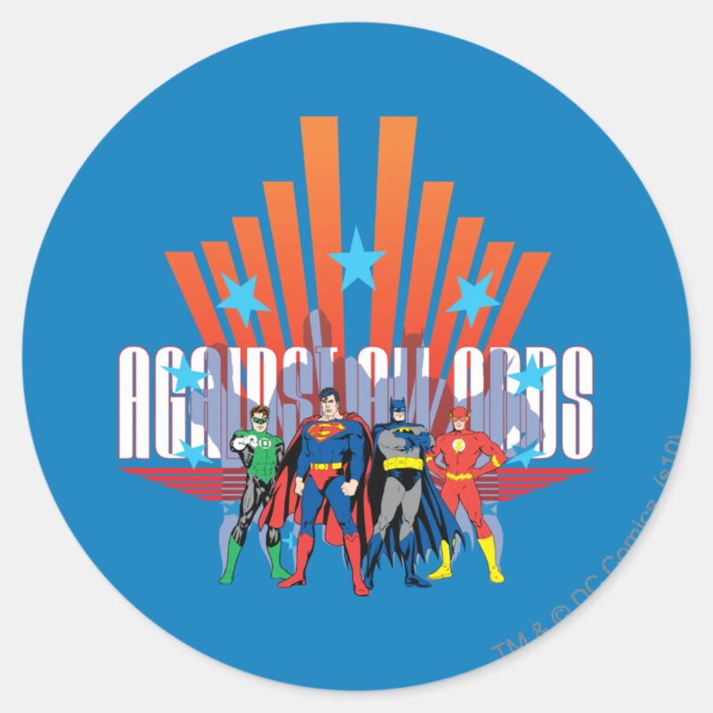 Justice League Against All Odds Classic Round Sticker vinyl sticker, waterproof durable collectible sticker for laptop, phone, bottle, bike, notebook, helmet, and accessories.