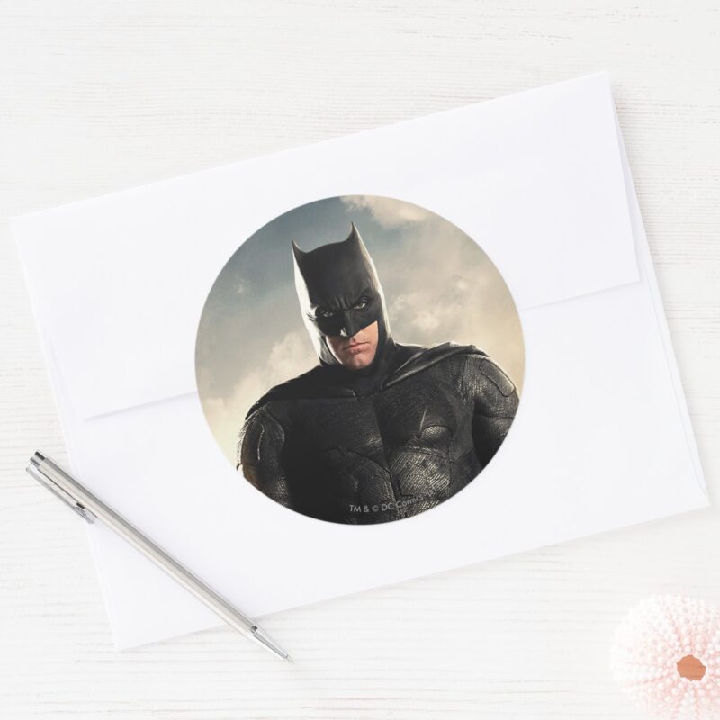Justice League Batman On Battlefield Classic Round Sticker vinyl sticker, waterproof durable collectible sticker for laptop, phone, bottle, bike, notebook, helmet, and accessories.