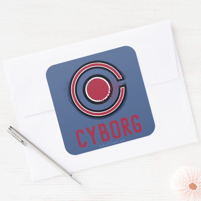 Justice League Brush Halftone Cyborg Symbol Square Sticker vinyl sticker, waterproof durable collectible sticker for laptop, phone, bottle, bike, notebook, helmet, and accessories.