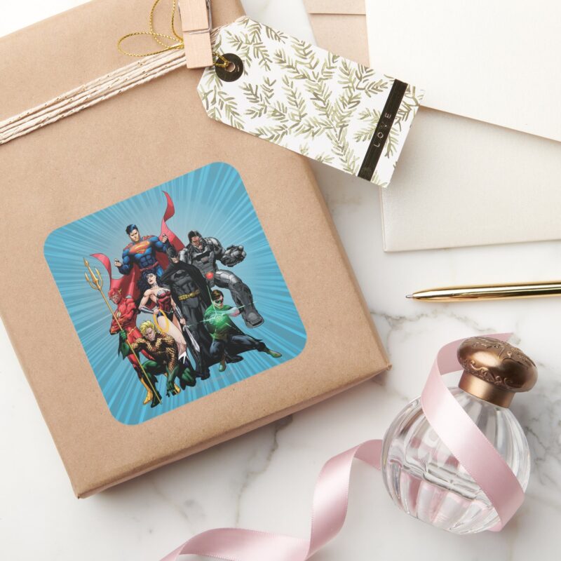 Justice League Group 2 Square Sticker vinyl sticker, waterproof durable collectible sticker for laptop, phone, bottle, bike, notebook, helmet, and accessories.