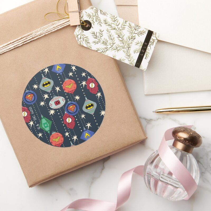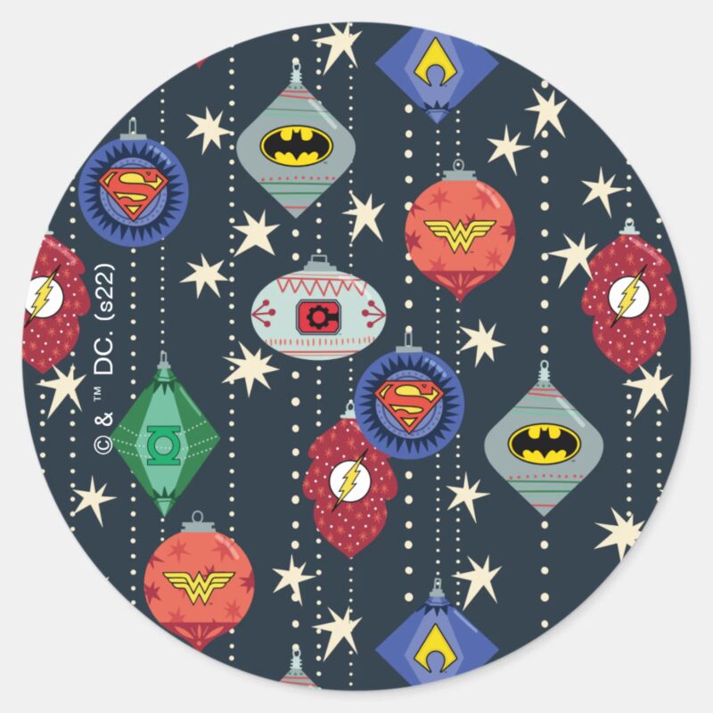 Justice League Holiday Bauble Pattern Classic Round Sticker vinyl sticker, waterproof durable collectible sticker for laptop, phone, bottle, bike, notebook, helmet, and accessories.
