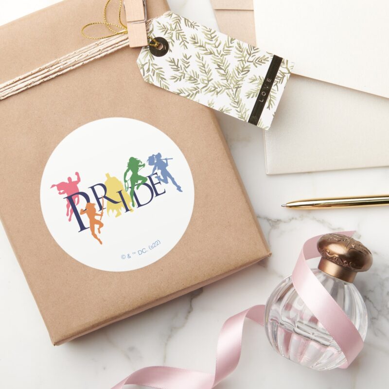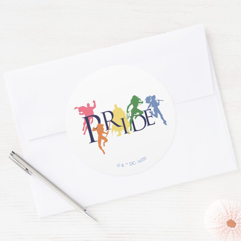 Justice League Pride Character Silhouettes Classic Round Sticker vinyl sticker, waterproof durable collectible sticker for laptop, phone, bottle, bike, notebook, helmet, and accessories.