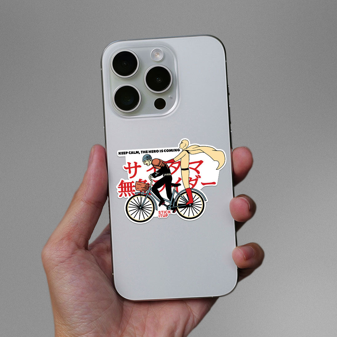 Keep Calm The Hero Is Coming Sticker vinyl sticker, waterproof durable collectible sticker for laptop, phone, bottle, bike, notebook, helmet, and accessories.