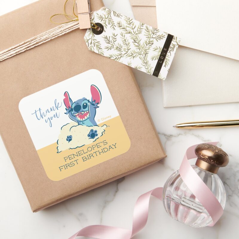 Lilo Stitch Beach Birthday Thank You Square Sticker vinyl sticker, waterproof durable collectible sticker for laptop, phone, bottle, bike, notebook, helmet, and accessories.