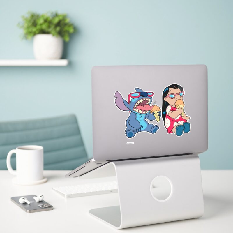Lilo Stitchs Lilo And Stitch Eating Ice Cream Sticker vinyl sticker, waterproof durable collectible sticker for laptop, phone, bottle, bike, notebook, helmet, and accessories.