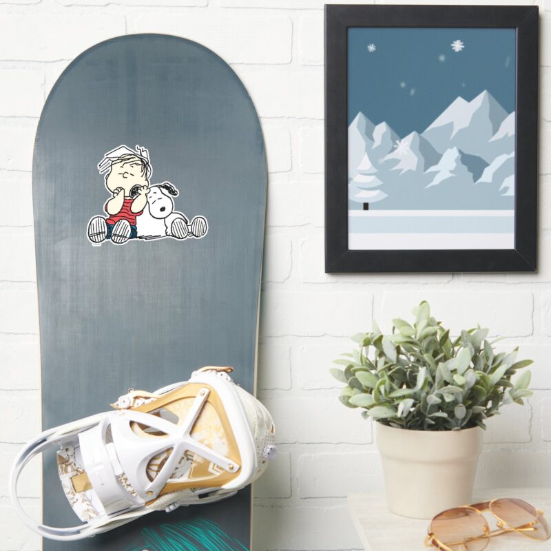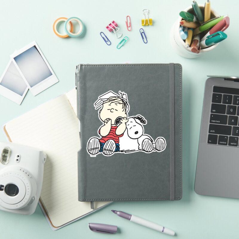 Linus Comforted With Snoopys Ear Sticker vinyl sticker, waterproof durable collectible sticker for laptop, phone, bottle, bike, notebook, helmet, and accessories.