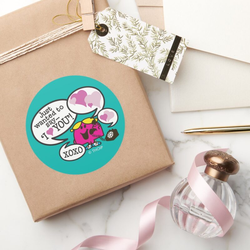 Little Miss Chatterbox Valentine Classic Round Sticker vinyl sticker, waterproof durable collectible sticker for laptop, phone, bottle, bike, notebook, helmet, and accessories.