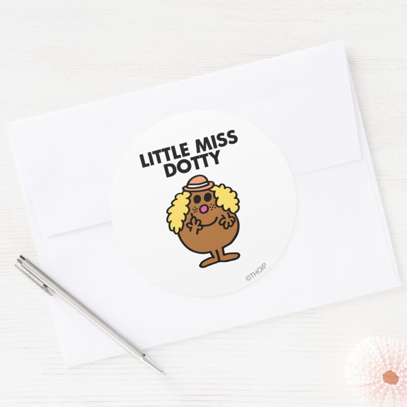 Little Miss Dotty Black Lettering Classic Round Sticker vinyl sticker, waterproof durable collectible sticker for laptop, phone, bottle, bike, notebook, helmet, and accessories.