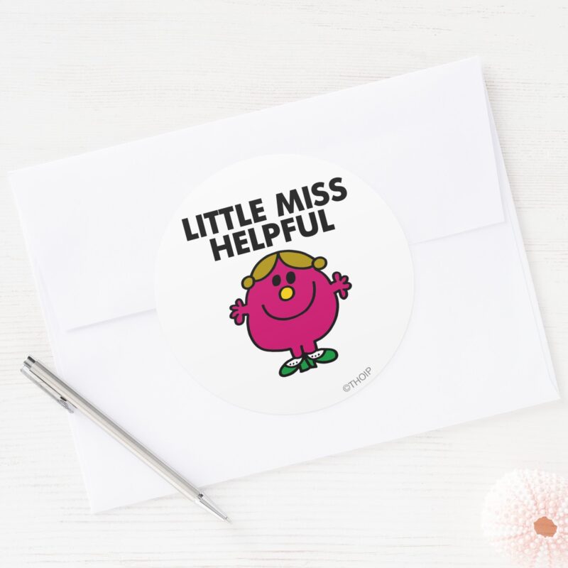 Little Miss Helpful Classic Classic Round Sticker vinyl sticker, waterproof durable collectible sticker for laptop, phone, bottle, bike, notebook, helmet, and accessories.