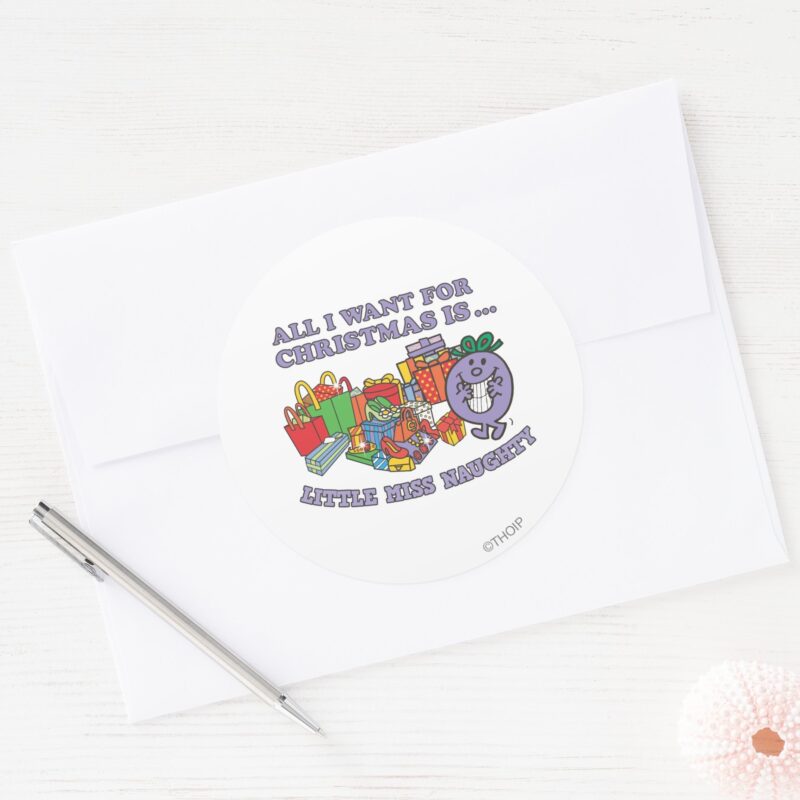 Little Miss Naughtys Christmas Joy Classic Round Sticker vinyl sticker, waterproof durable collectible sticker for laptop, phone, bottle, bike, notebook, helmet, and accessories.