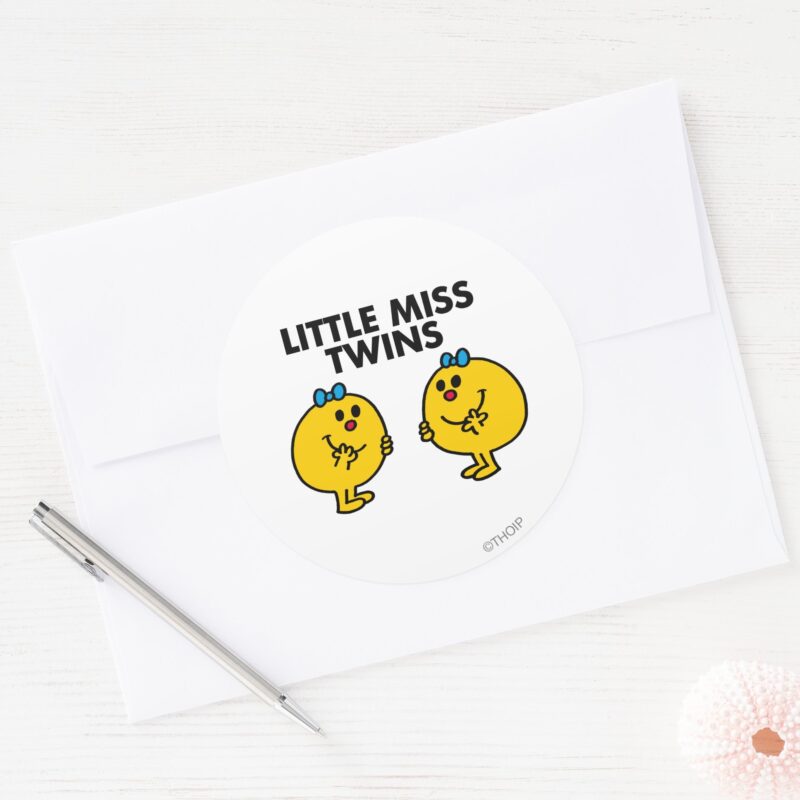 Little Miss Twins Two Much Fun Classic Round Sticker vinyl sticker, waterproof durable collectible sticker for laptop, phone, bottle, bike, notebook, helmet, and accessories.