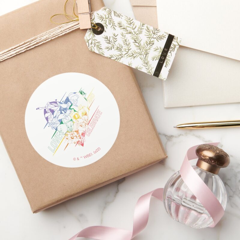 LOONEY TUNES™ Love And Celebrate Classic Round Sticker vinyl sticker, waterproof durable collectible sticker for laptop, phone, bottle, bike, notebook, helmet, and accessories.