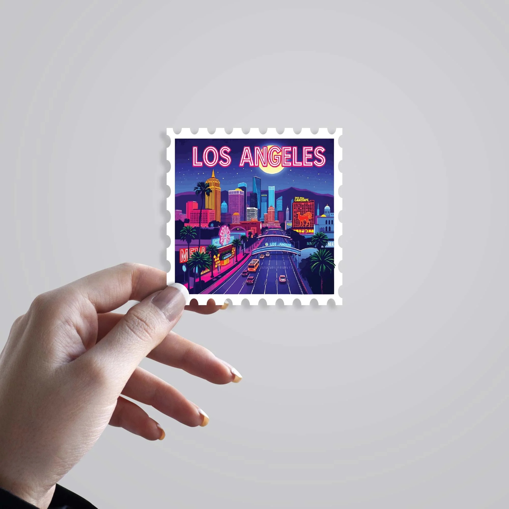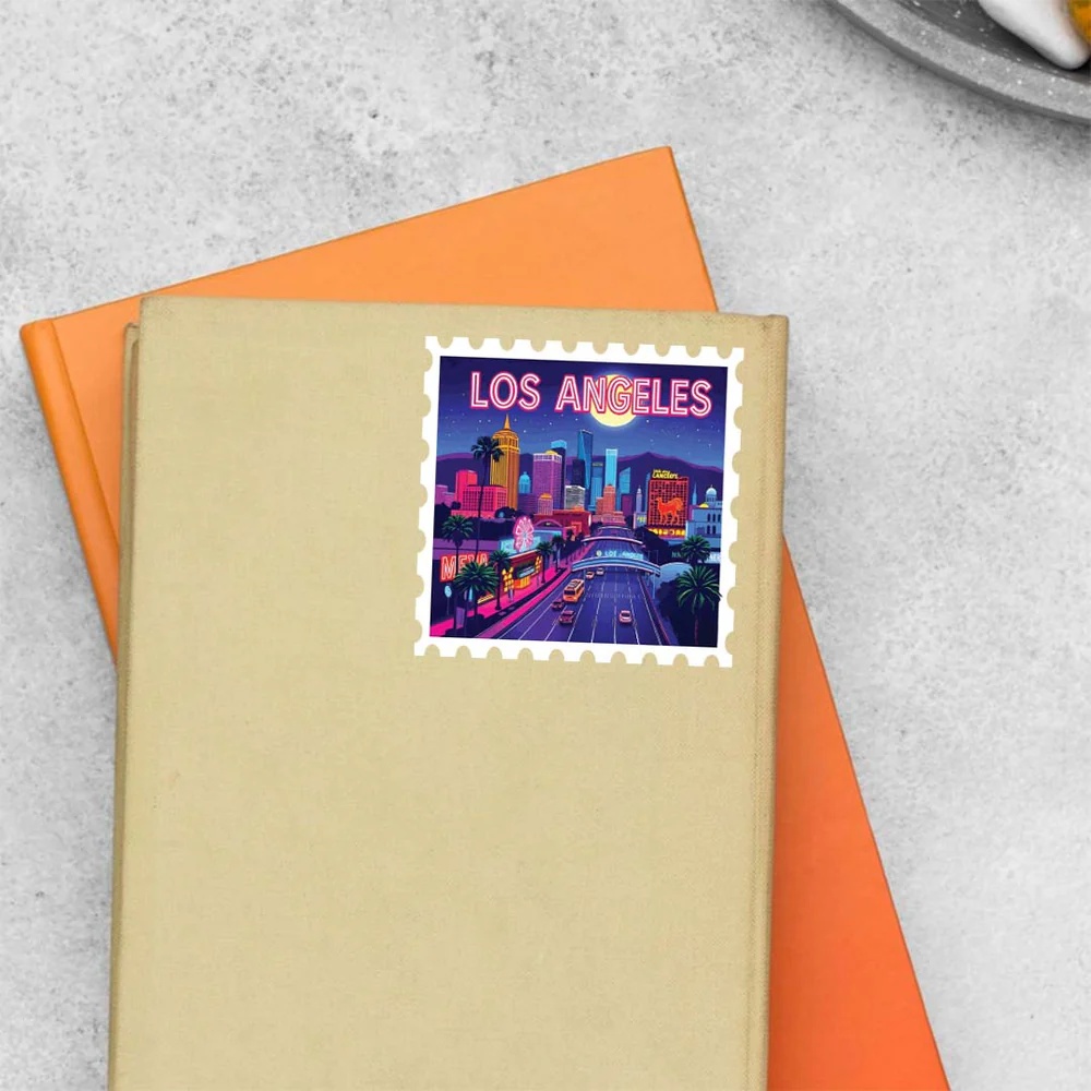 Los Angeles Neon Night Skyline Post Stamp Travels Stickers vinyl sticker, waterproof durable collectible sticker for laptop, phone, bottle, bike, notebook, helmet, and accessories.