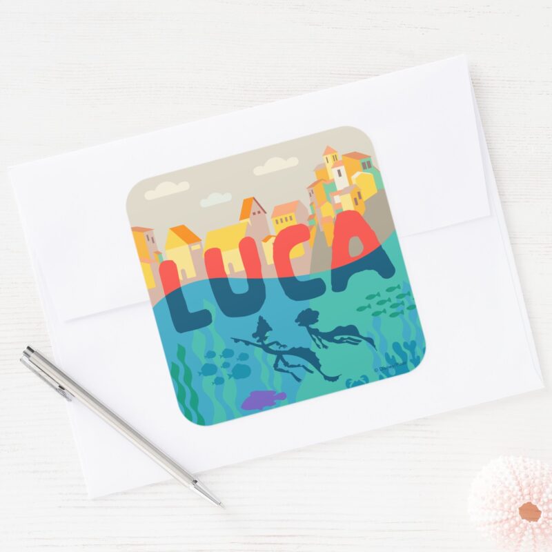 Luca Above And Below With Alberto Luca Square Sticker vinyl sticker, waterproof durable collectible sticker for laptop, phone, bottle, bike, notebook, helmet, and accessories.