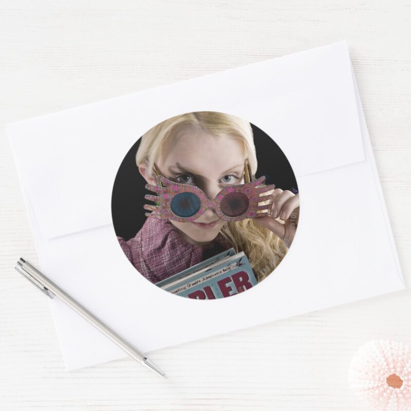 Luna Lovegood Peeks Over Glasses Classic Round Sticker vinyl sticker, waterproof durable collectible sticker for laptop, phone, bottle, bike, notebook, helmet, and accessories.