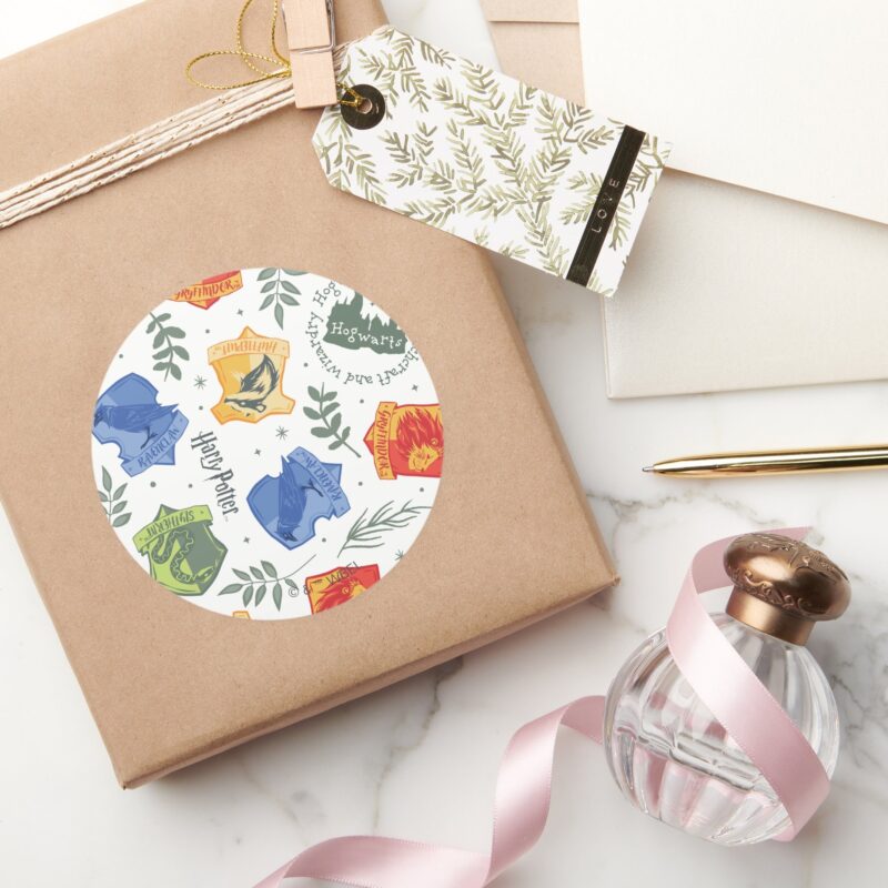 Magical Herbology HOGWARTS™ Houses Pattern Classic Round Sticker vinyl sticker, waterproof durable collectible sticker for laptop, phone, bottle, bike, notebook, helmet, and accessories.