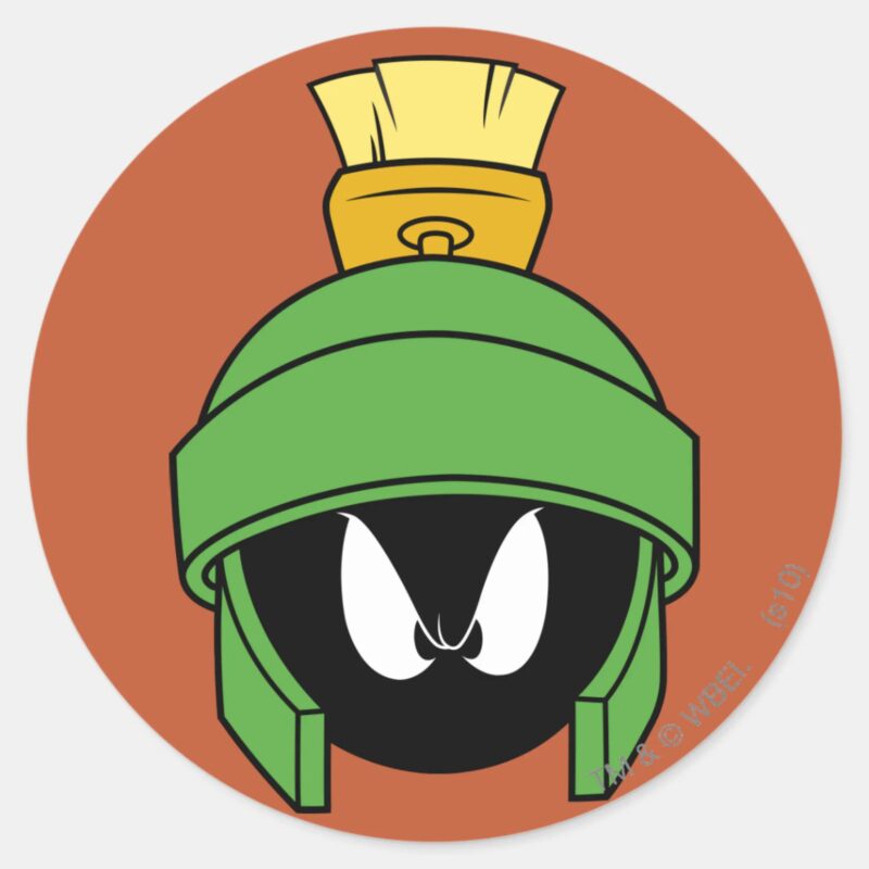 MARVIN THE MARTIAN™ Mad Classic Round Sticker vinyl sticker, waterproof durable collectible sticker for laptop, phone, bottle, bike, notebook, helmet, and accessories.